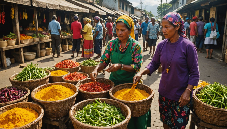 Les produits locaux réunionnais constituent le socle de cette gastronomie traditionnelle. Le curcuma frais colore et parfume les plats, tandis que le combava apporte ses notes citronnées incomparables. Les légumes pays comme le chouchou, la christophine et les brèdes occupent une place centrale dans les préparations quotidiennes. Les fruits tropicaux enrichissent la palette gustative : mangue verte en achards, jacque en curry ou letchi en dessert. Le piment, cultivé selon des variétés locales, dose la force de chaque recette. Ces ingrédients poussent naturellement sous le climat tropical, bénéficiant des sols volcaniques fertiles. Les épices fraîches remplacent systématiquement leurs équivalents séchés, apportant une intensité aromatique exceptionnelle. Cette proximité entre production et consommation garantit la fraîcheur des produits et maintient vivantes les traditions culinaires. Chaque marché forain perpétue cette économie de circuit court, essentielle à l'authenticité des saveurs.